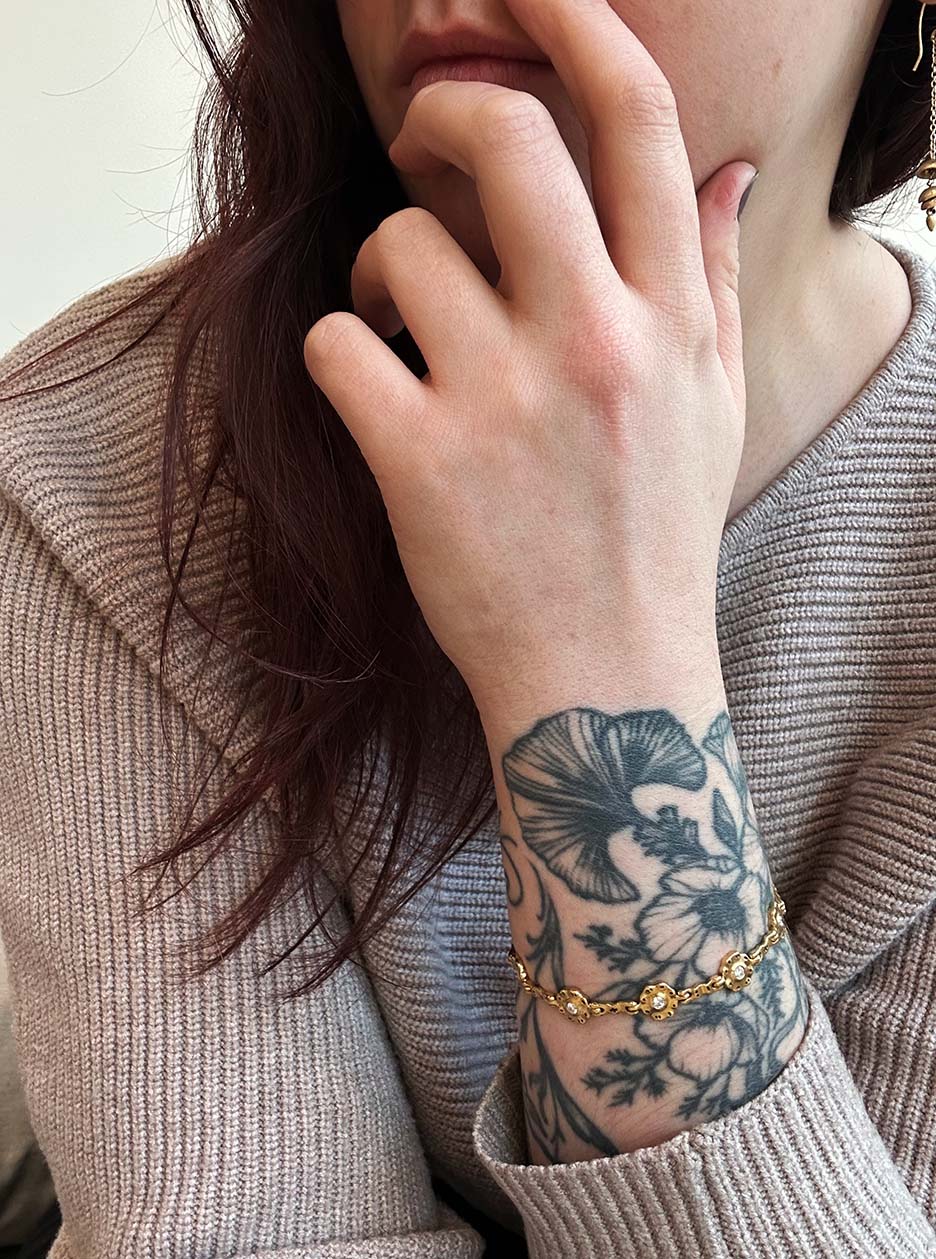 Alex Sepkus' "Flora" bracelet is made out of Alex's signature flora charm linked together to create a breathtaking bracelet, featuring small white diamonds in the center of each flower.