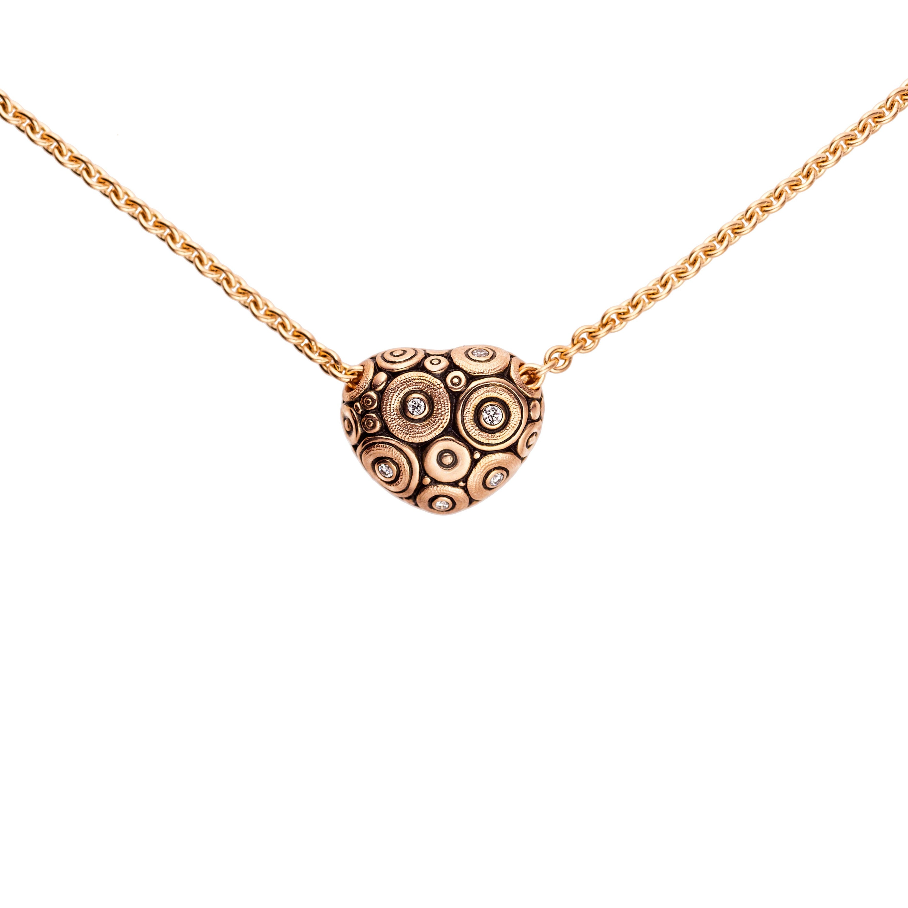 Alex Sepkus' ' Heart Shaped' pendant in 18k rose gold with 6 diamonds, .04 total carat weight. Price includes chain.