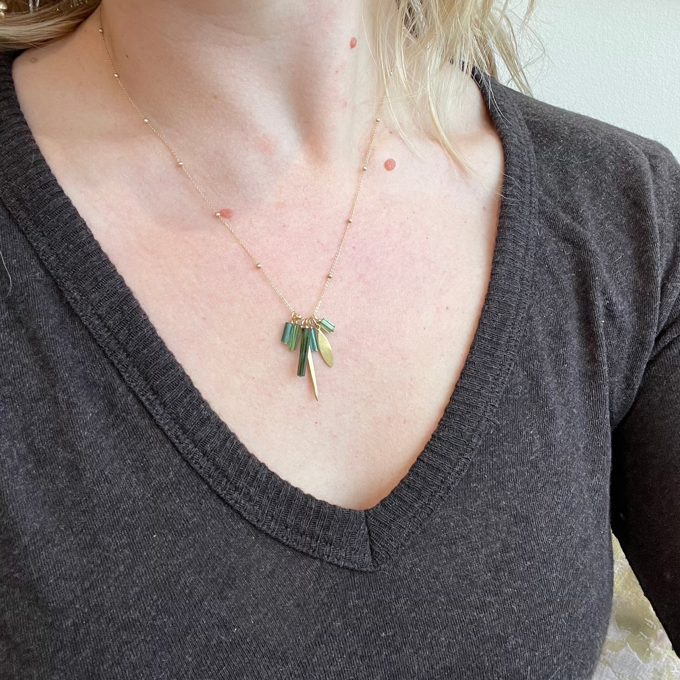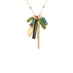 This eye-catching necklace by Ananda Khalsa features 5 green tourmaline crystals and 2 warm 22K yellow gold charms. The charms hang delicately from a 14K yellow gold ball chain.