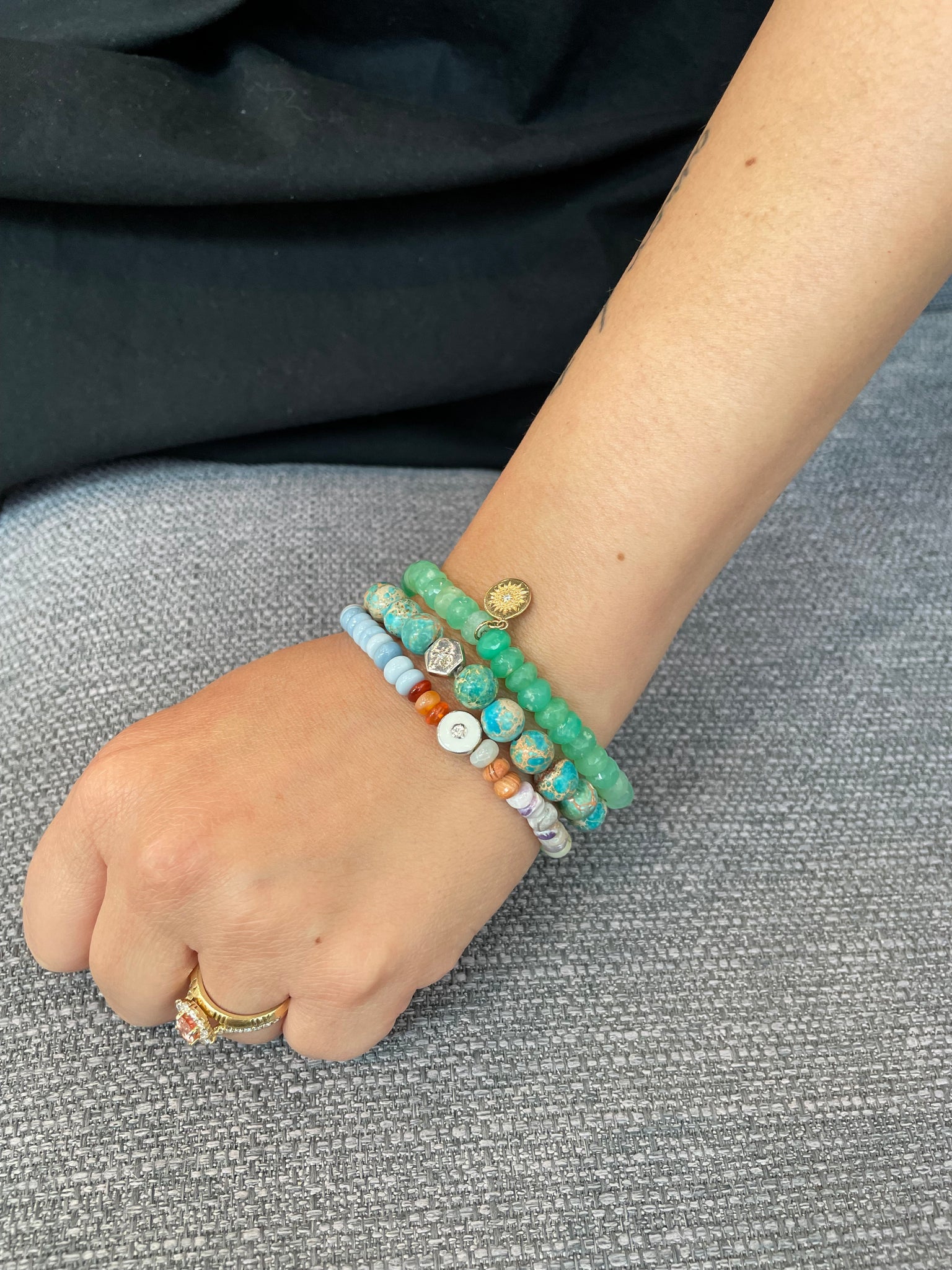 By Anzie, this bracelet is strung with glowing faceted chrysprase beads and features a 14k yellow gold charm with a small diamond at its center.