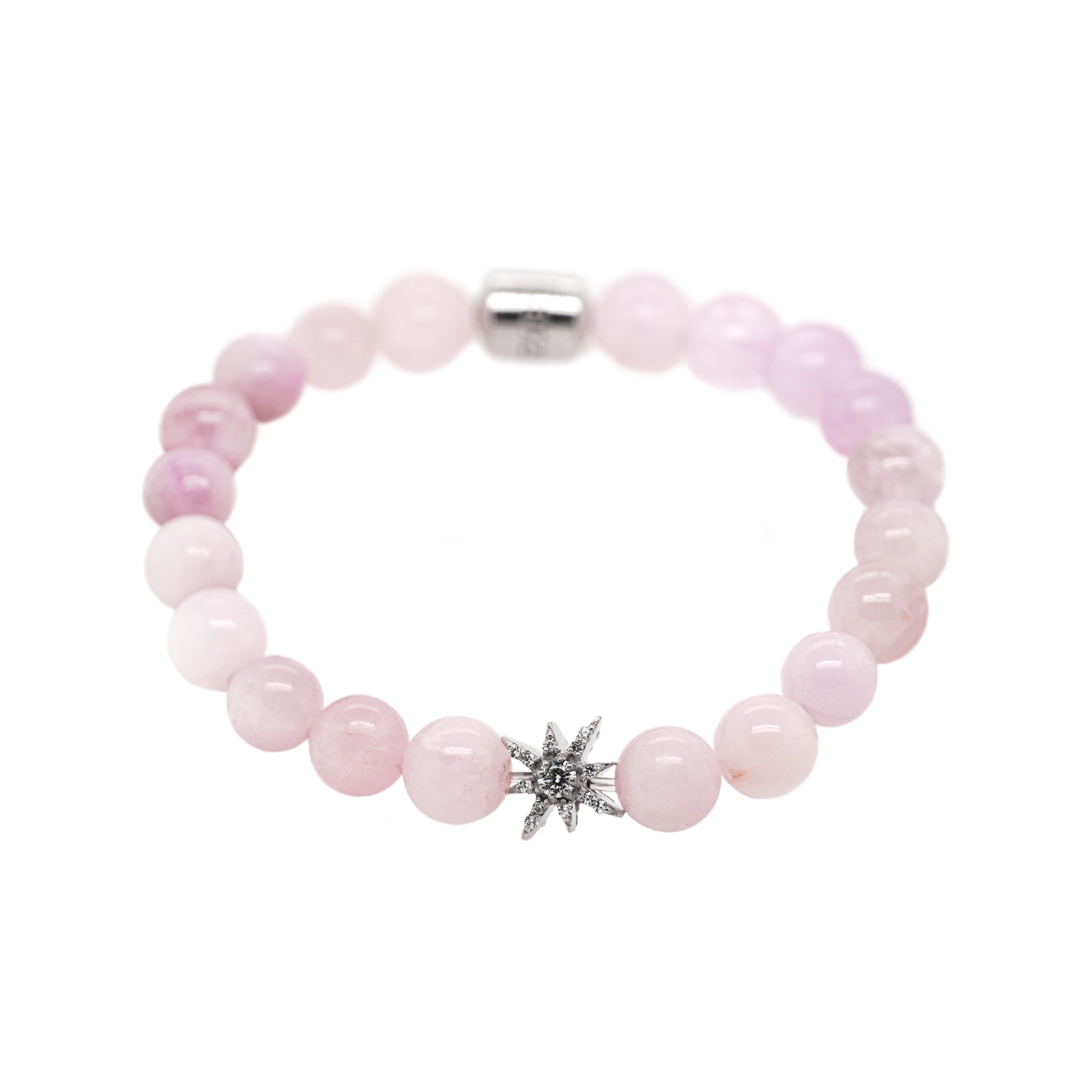 By Anzie, this bracelet is strung with beautiful round kunzite beads, featuring a rhodium plated silver starburst bead with a white topaz at its center.