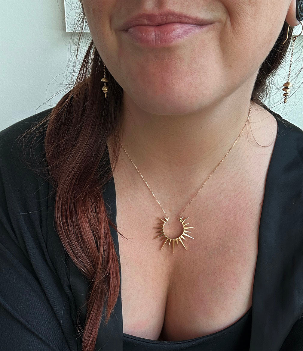 This magnificent full sun pendant on thin gold chain is an iconic Celine Daoust silhouette. The sun represents the source of all life on earth: strength, illumination, and clarity