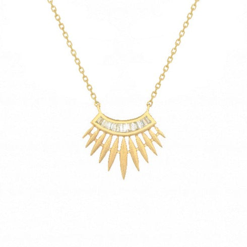 Celine Daoust's Rising Sun necklace features her rising sun design, which depicts rays emanating from the baguette diamond center. Made of 14k yellow gold, and diamonds, this necklace is divine.