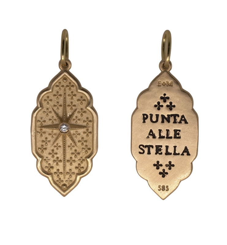 From Erica Molinari, this charm is made out of 14K yellow gold, featuring an elongated north star motif on the front with a white diamond set in the center of the star. On the back of the charm, the translation reads, "Follow your own star."