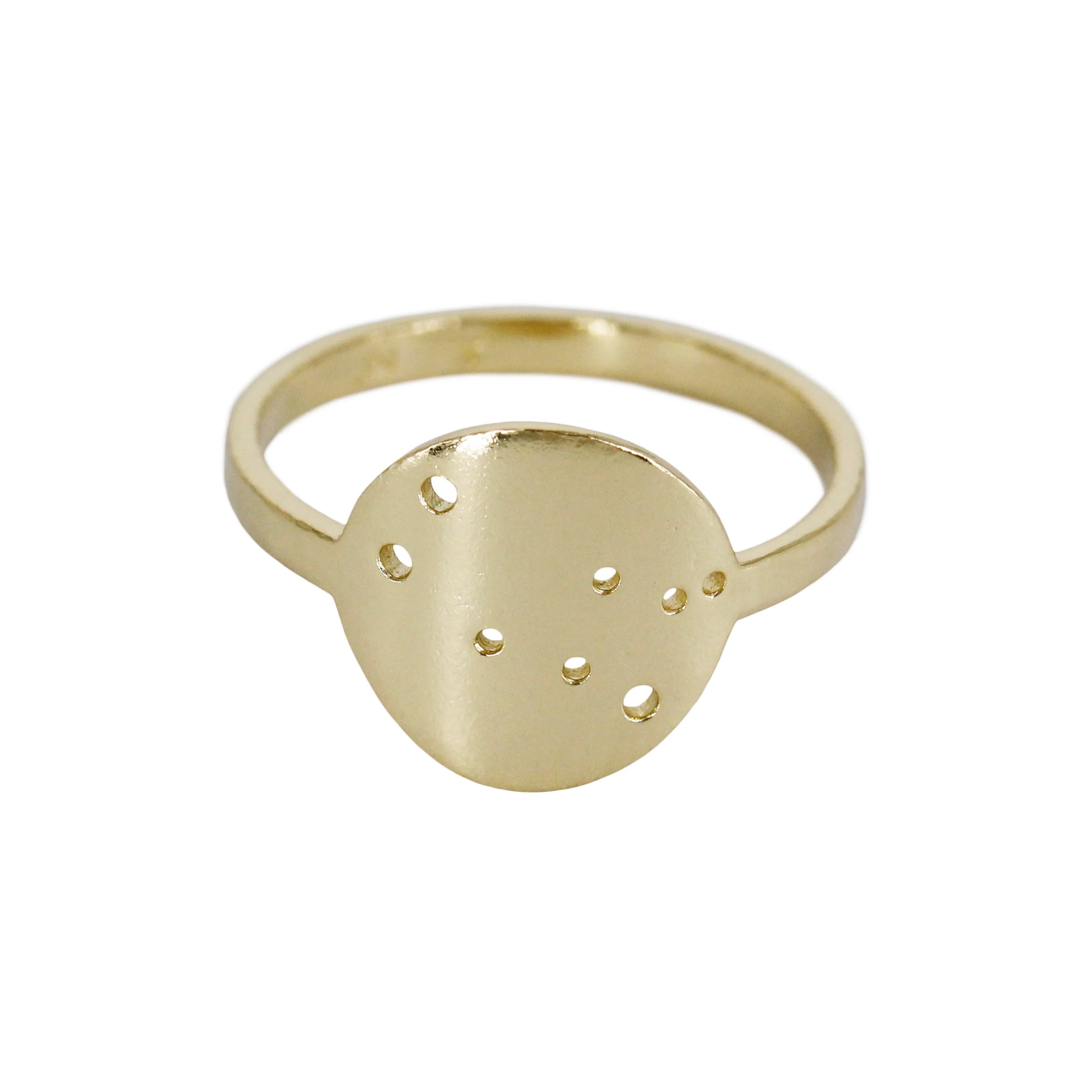 From Julie Nolan, this zodiac ring features the Gemini constellation pierced into a small 14k yellow gold face, inspired by simple illustrations of zodiac constellations from a 19th century Swiss calendar.