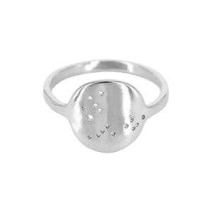 From Julie Nolan, this zodiac ring features the Pisces constellation pierced into a small sterling silver face, inspired by simple illustrations of zodiac constellations from a 19th century Swiss calendar.