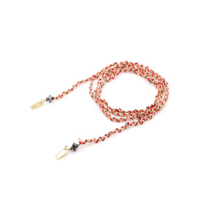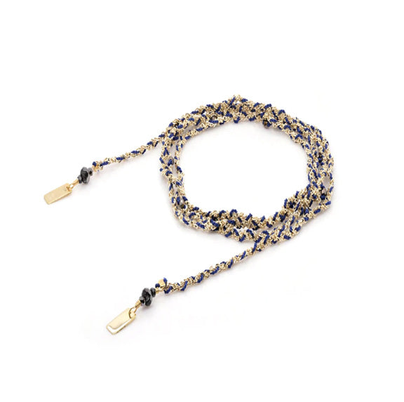 From Marie Laure Chamorel, this this iconic hand-braided open necklace with forçat Sterling silver chains and twisted silk yarn encrusted with tiny crystal beads. All parts are dipped in yellow gold.