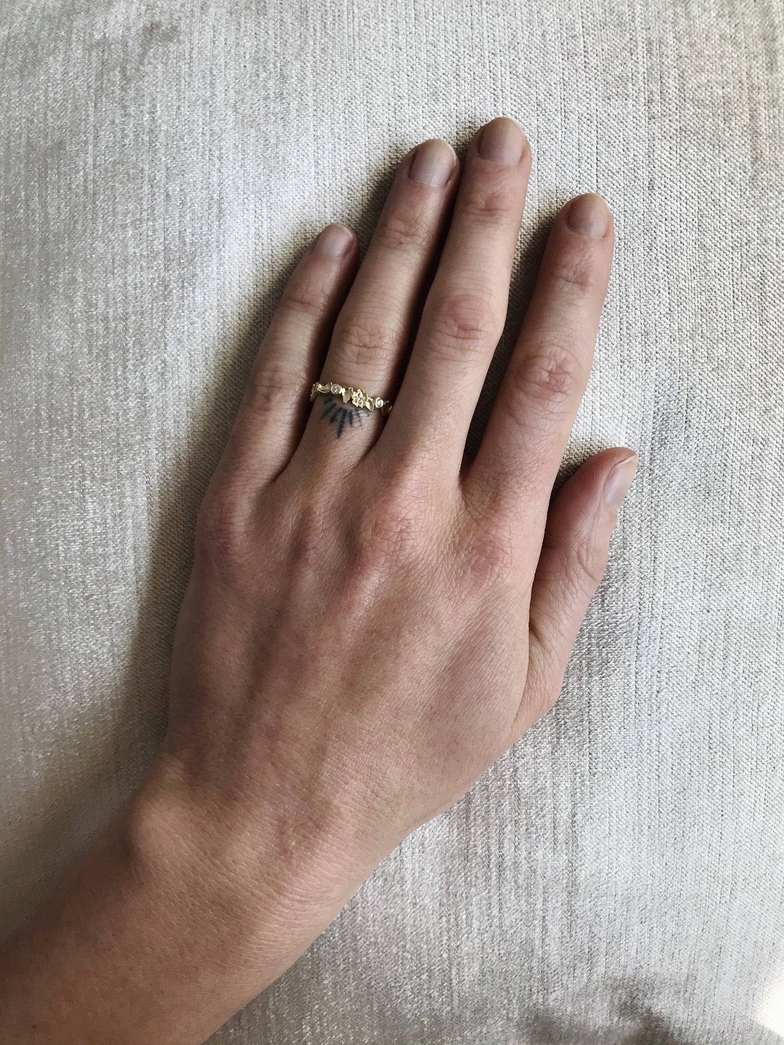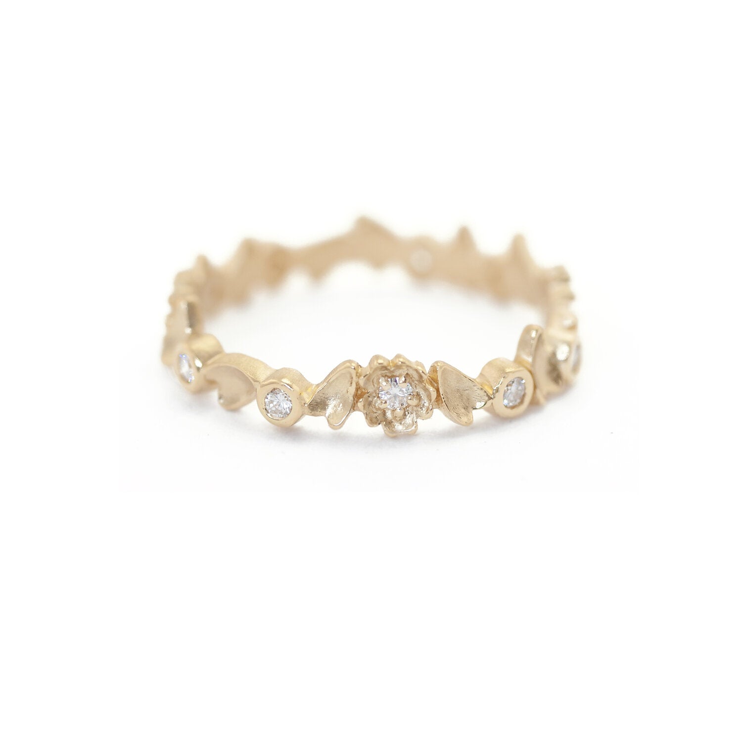 From Megan Thorne, this intricately designed 18K yellow gold band has brilliant cut diamonds set in butter cup flowers around the entirety.