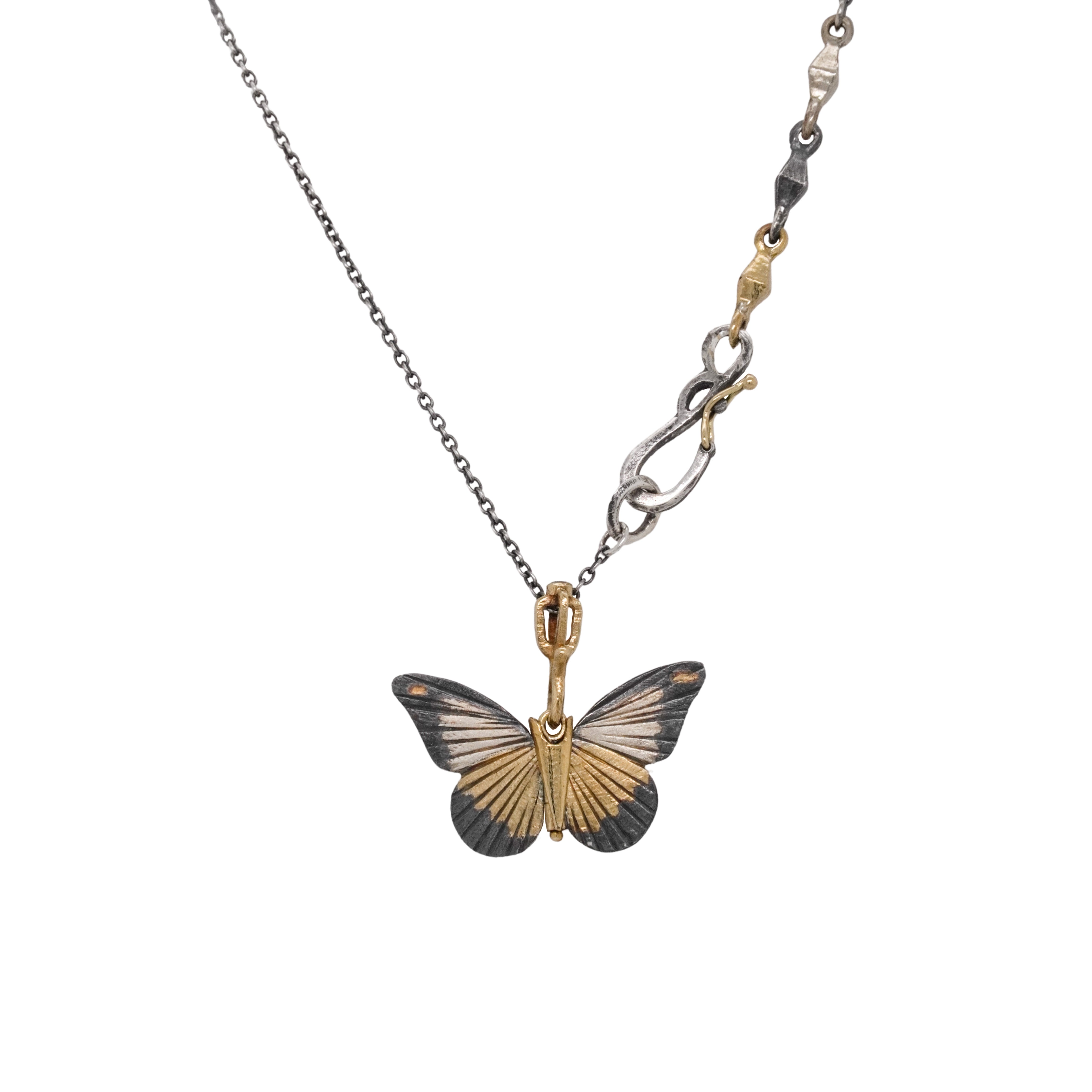 This beautiful, articulated butterfly from James Banks is composed of 18K white gold, and 18K yellow gold, with an 18K yellow gold "scepter" bail set with a small round cut black diamond on top, hanging on an oxidized silver chain.