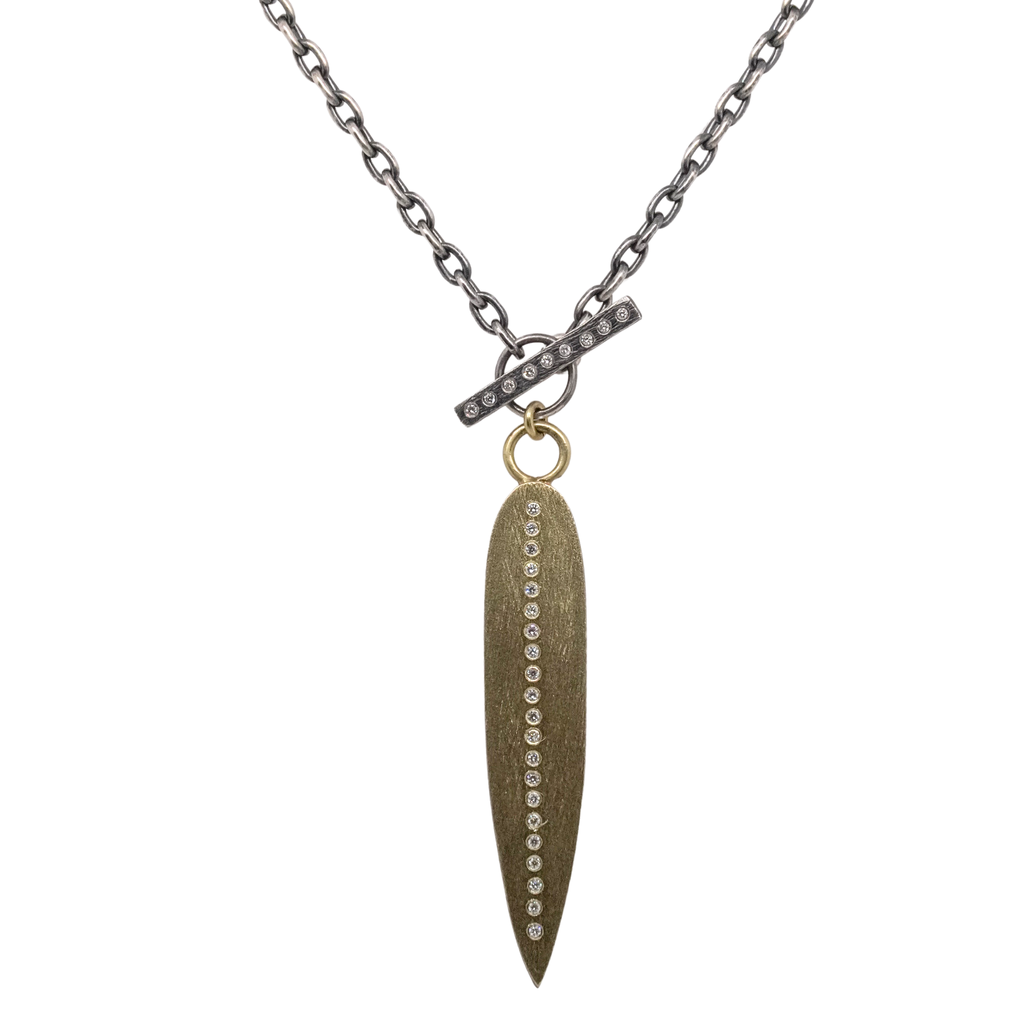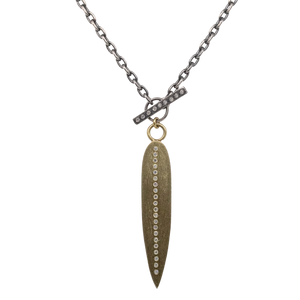 The Large Palaso Lariat Necklace by Rene Escobar is made out of oxidized and textured sterling silver, set with multiple white diamonds ( 0.22 tcw ), featuring a large 18k yellow gold leaf pendant.