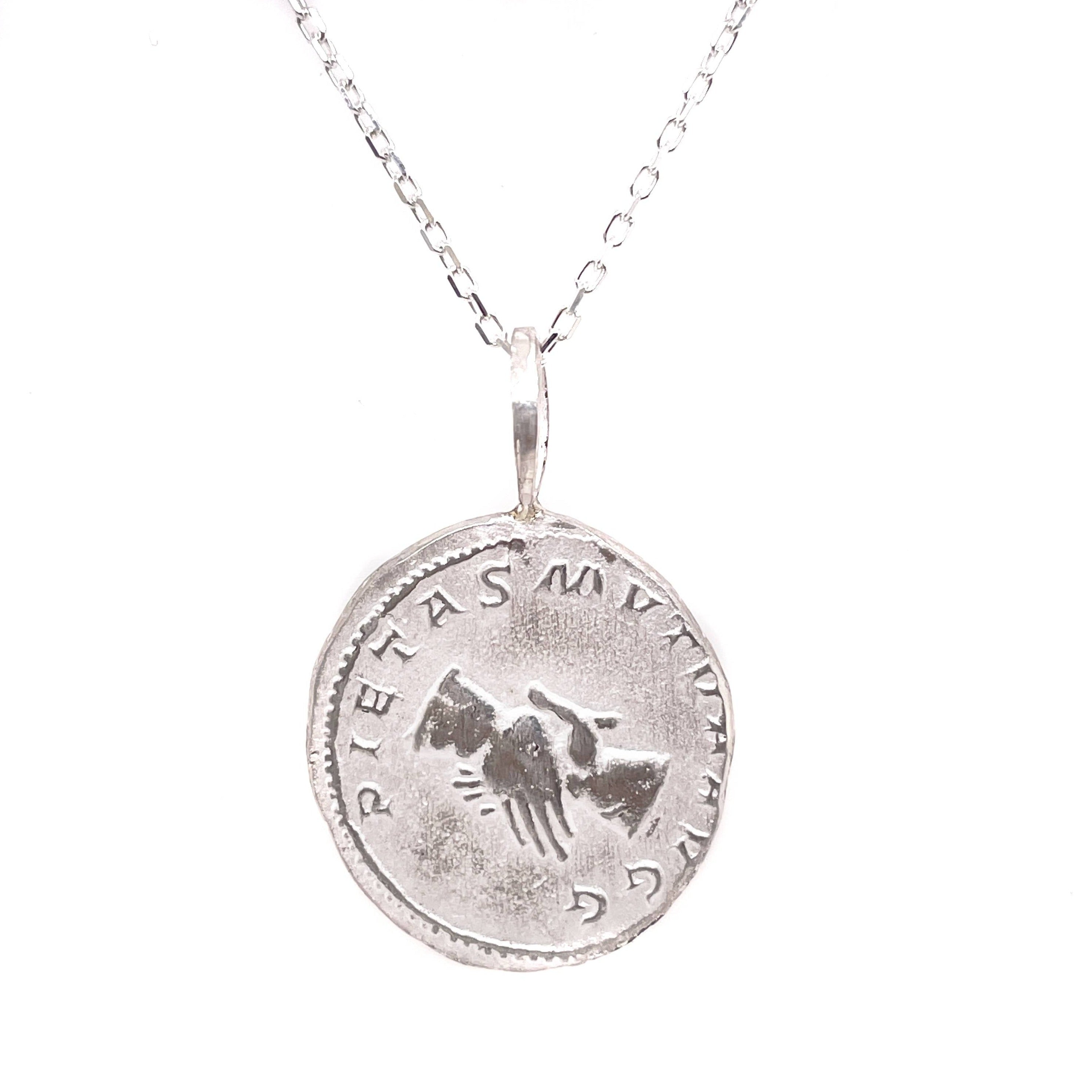 This sterling silver necklace from Robin Haley features a pendant cast from an ancient coin from Rome, 238AD. The pendant hangs from a sterling silver chain.