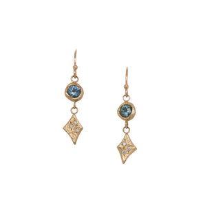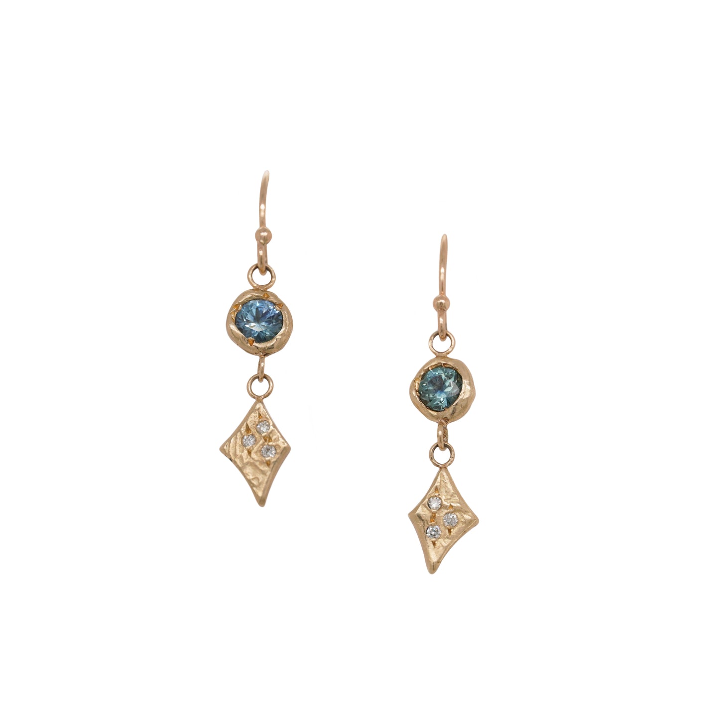 From Robin Haley, these 14k yellow gold earrings are made with beautiful Montana Sapphires and white diamonds.