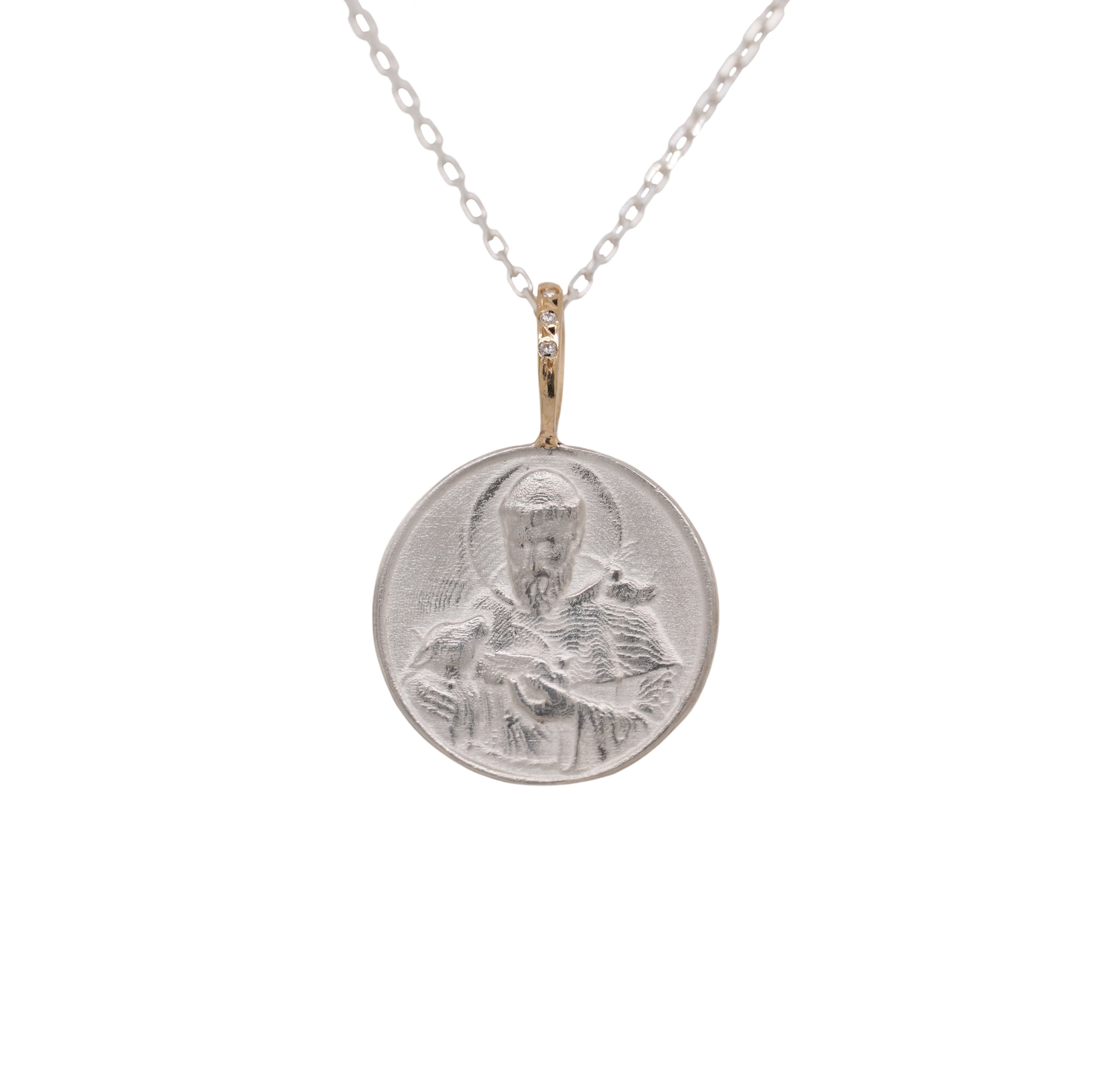 This sterling silver necklace from Robin Haley features a pendant cast from an ancient coin from Italy circa 1800. The bail of the pendant is made out of 14k yellow gold with three small flush set diamonds. The pendant hangs from a sterling silver chain.