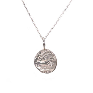 This sterling silver necklace from Robin Haley features a reversible pendant, cast from an ancient coin from Rome circa 19BC.