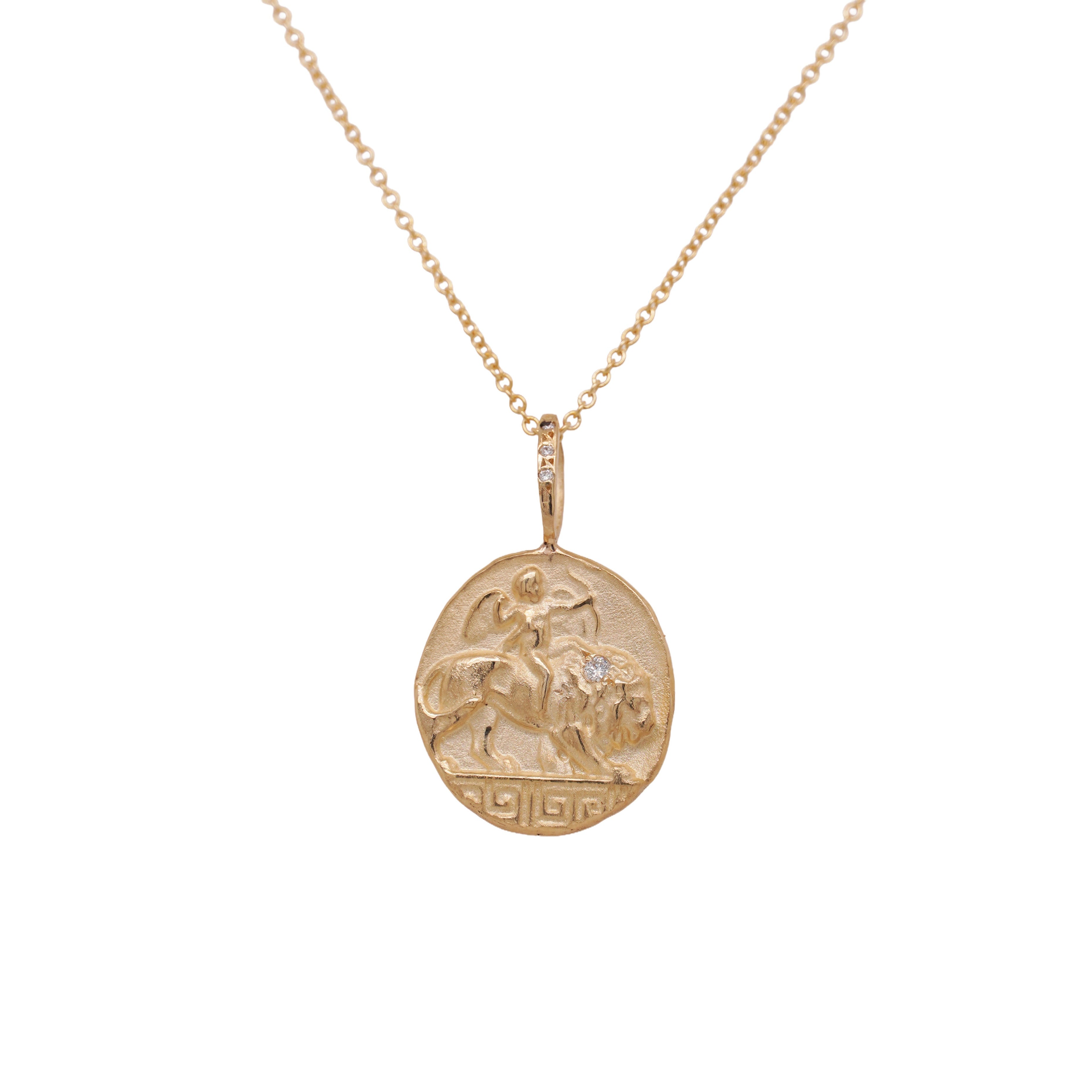 From Robin Haley, this necklace is made out of 14k yellow gold and white diamonds, featuring a lion and an archer on the front of the pendant.