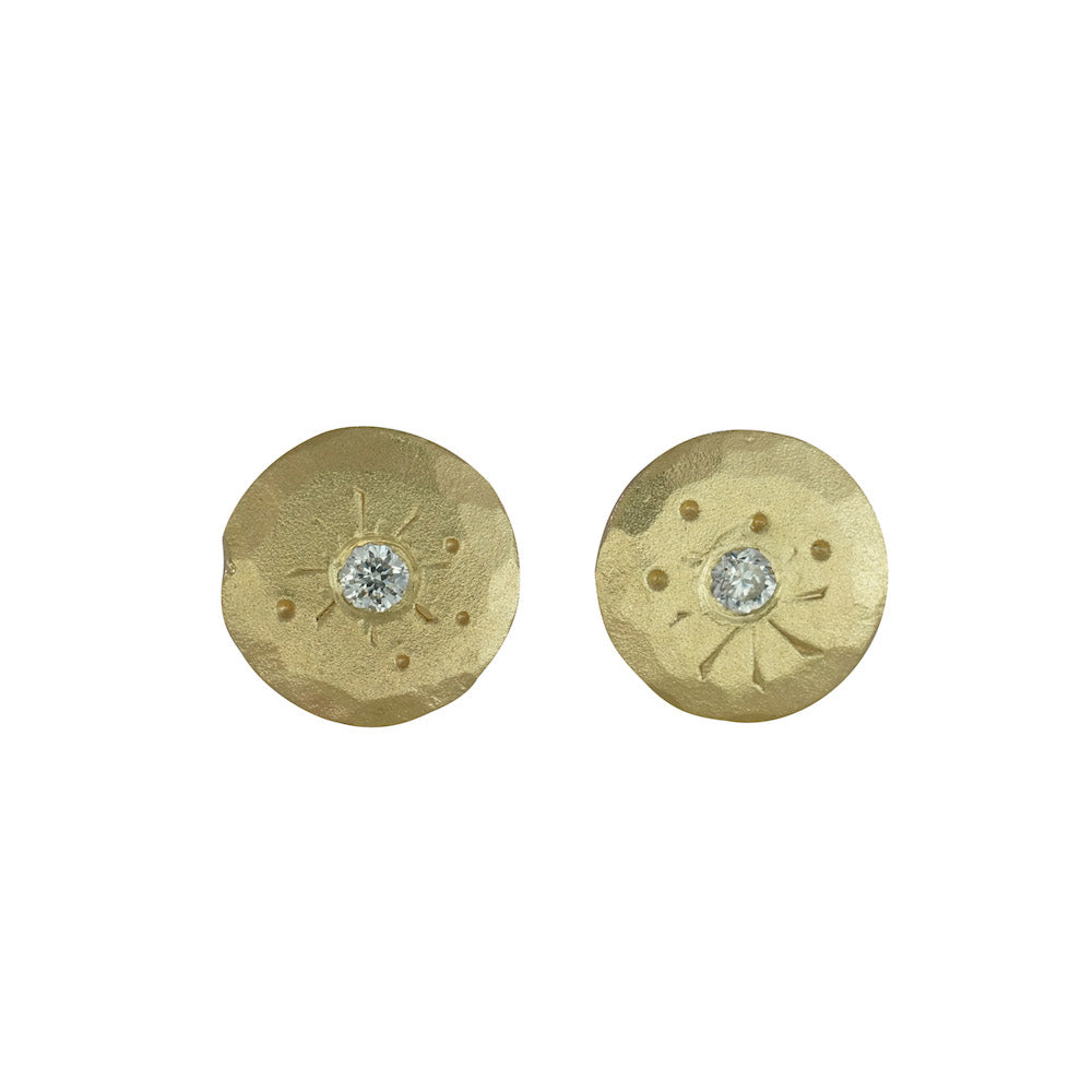 Little coins have been hand distressed to recall the look of ancient treasure. These earrings sit nice and flat on the ears, making them the perfect everyday earrings you'll never want to part with. Sparkling diamonds add a subtle hint of luxury.