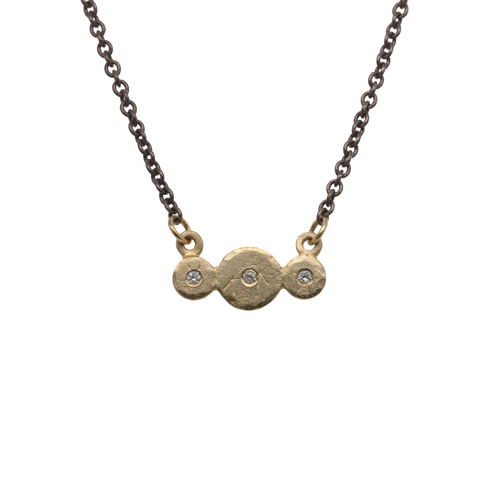 A delicate grouping of 14K yellow gold treasure coin pieces from Sarah Swell, set with diamonds. Coins hang from a sterling silver chain.