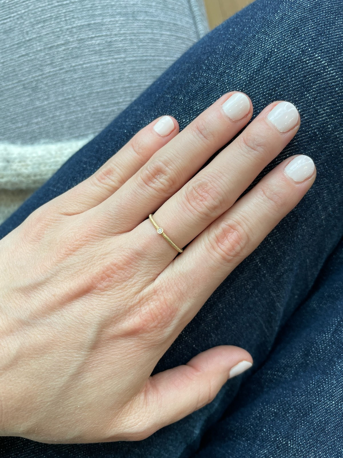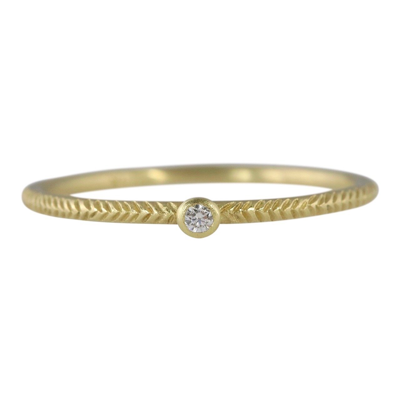 This 14k yellow gold stacking ring features and delicate .02ct round white diamond and Sarah Swell's signature feather texture along the entirety of the band.