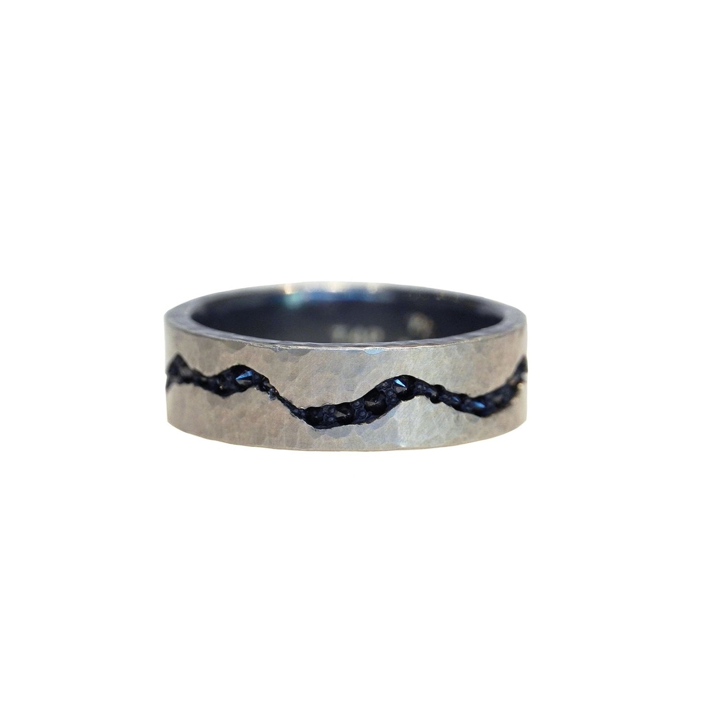 From TAP by Todd Pownell, this unique ring is 7mm wide made from platinum layered over sterling silver with inverted single cut black diamonds.