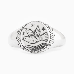 This sterling silver signet ring from Digby & Iona features oxidized engraving of a sea bird in flight.