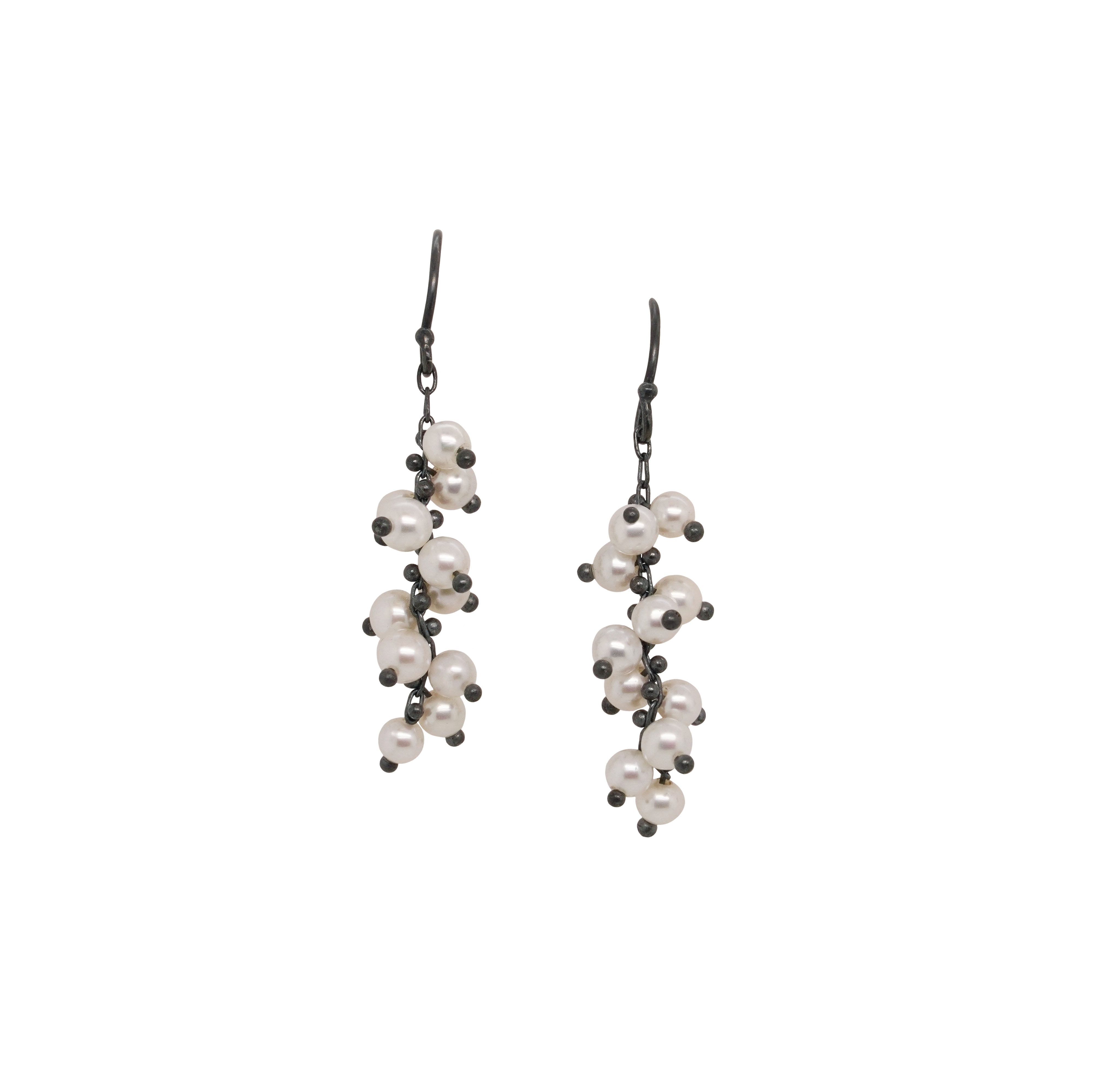 Handmade by TENTHOUSANDTHINGS, these earrings feature pearl beads strung together in a cluster, hanging from an oxidized sterling silver chain.