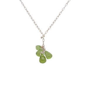 Handmade by TENTHOUSANDTHINGS, this necklace features hand cut peridot beads strung together in a cluster, hanging from a sterling silver chain.