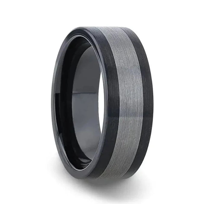 Endast black ceramic wedding band is the perfect ring for those who take their style seriously! This scratch-resistant, hypoallergenic black ceramic wedding band features a silver tungsten inlay that stands out from the rest! This modern ring is available in 8mm width, and it also includes a brushed finish and flat edges for a contemporary look. The comfort fit design features a domed interior that makes the ring slide over the knuckle easier with less friction.