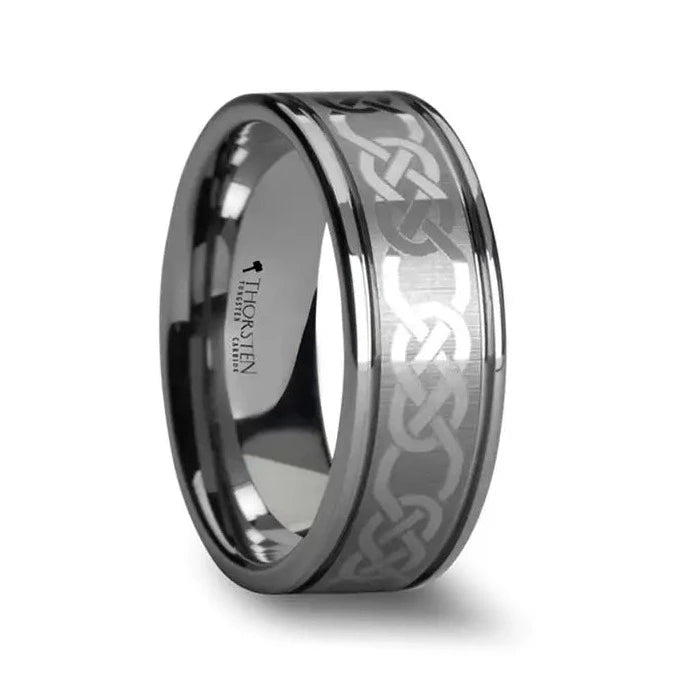 The ancient Celtic pattern that is laser engraved in this beautifully designed wedding band by Thorsten symbolizes never ending love and is flanked by two off-set grooves.