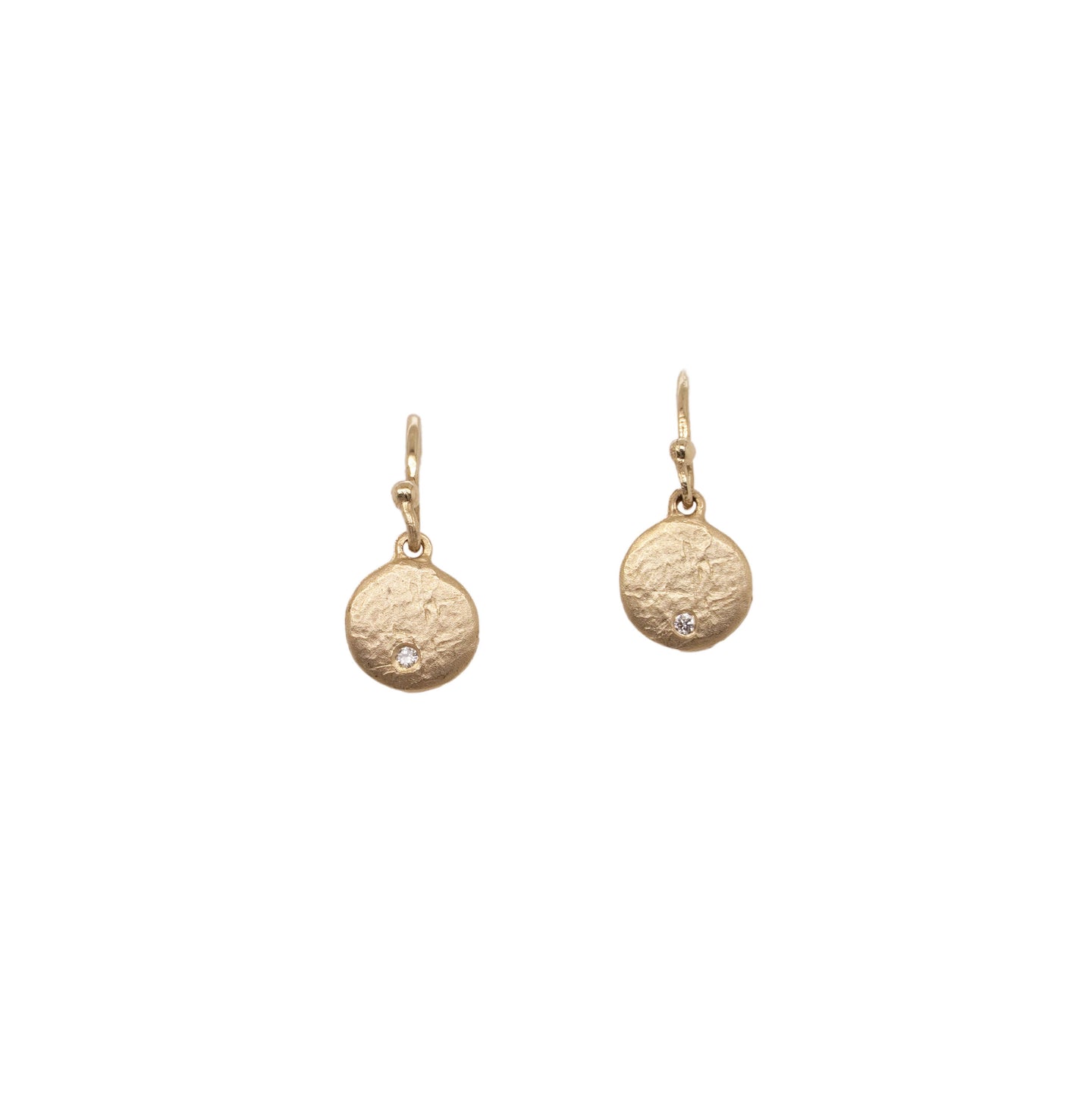 From Victoria Cunningham, these dangle earrings feature a simple and elegant 14k gold disk with a single diamond sparkle.