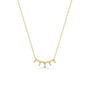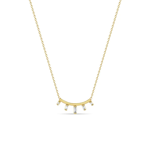 14k yellow gold cable chain necklace with a curved square bar and five baguette diamonds in graduating sizes set perpendicular underneath the bar.