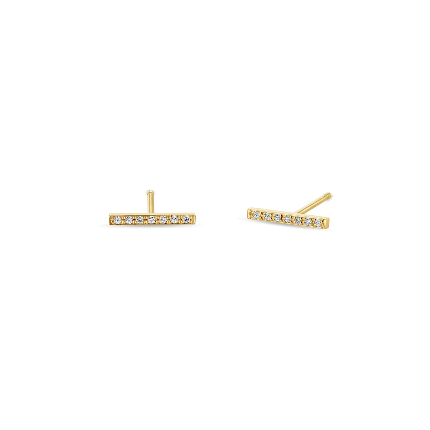 14k gold bar stud earrings with a row of pavé set round white diamonds.
