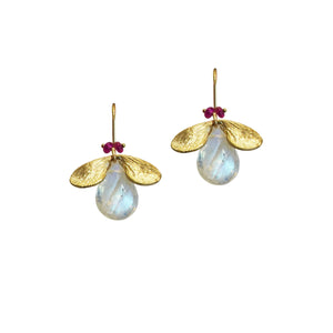 From Annette Ferdinandsen, these whimsical Rainbow Moonstone Bug Earrings with Ruby eyes are made out of 14K yellow gold.
