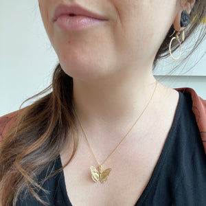 From James Banks Design, this intricate, saw-pierced monarch butterfly is is made out of 18k yellow gold. The center is hinged and articulated, making the necklace move beautifully on the neck. The symbolism that a butterfly holds is perfect for commemorating new beginnings.