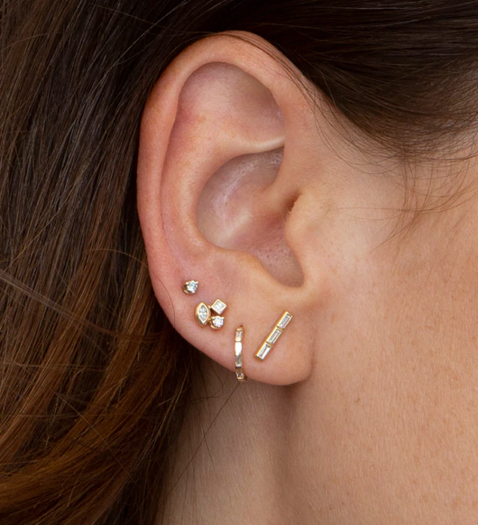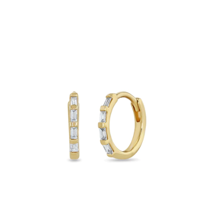 14k yellow gold hinge huggie hoop earrings from Zoe Chicco are set with four vertical baguette diamonds.