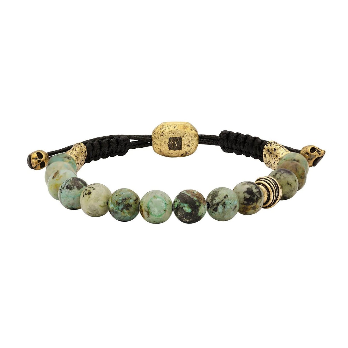 Handcrafted by John Varvatos with attitude - this adjustable braided cord bracelet is crafted from turquoise and brass beads, finished with brass skull ends.