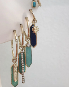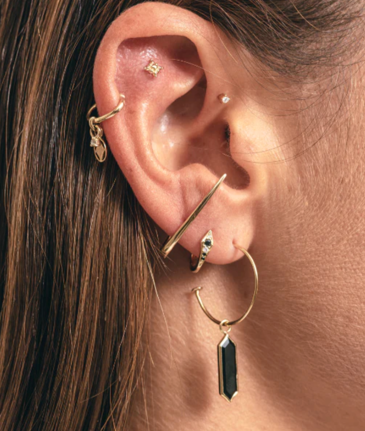 From Metier by Tomfoolery, these striking Gemstone Hexa Plaque features your choice of a black spinel or moonstone set in 9k yellow gold – a bold, vibrant addition to our classic gemstone collection. These larger, statement-making plaques are perfectly complemented by any Metier hoops. Add one or two of them to the clicker hoops to go from simple to unique.