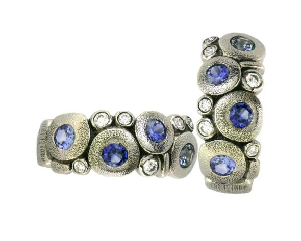 A classic design, these Platinum huggies from Alex Sepkus feature his signature "Candy" design with an assortment of mixed blue sapphires and scattered brilliant cut diamonds.