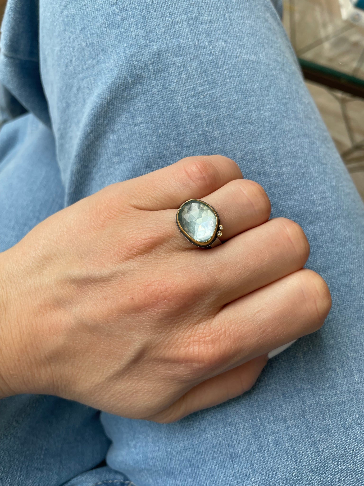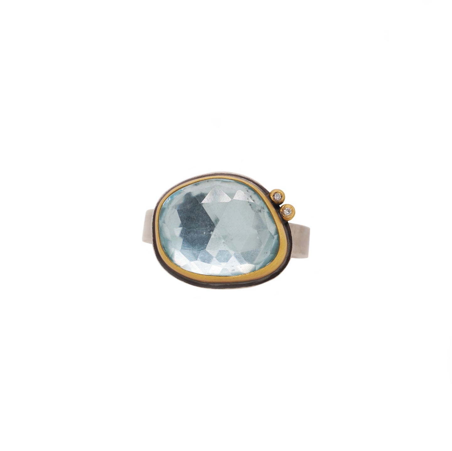 From Ananda Khalsa, this beautiful ring is made out of sterling silver, featuring a gorgeous light blue topaz bezel set in luscious 22k yellow gold, with two diamond dot accents.