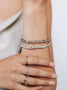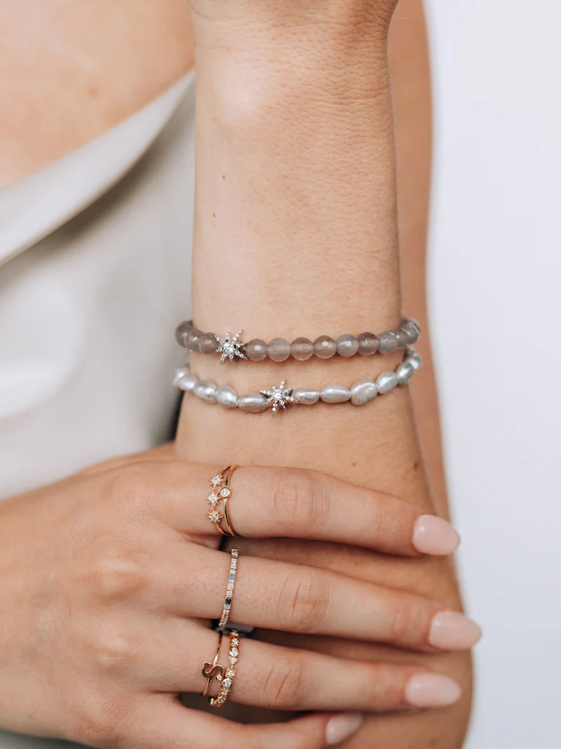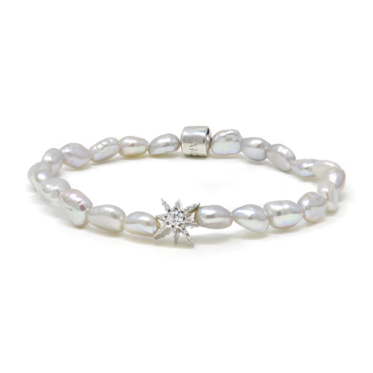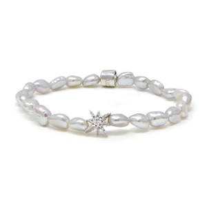By Anzie, this bracelet is strung with beautiful white Keshi pearls, featuring a rhodium plated silver starburst bead with a white topaz at its center.