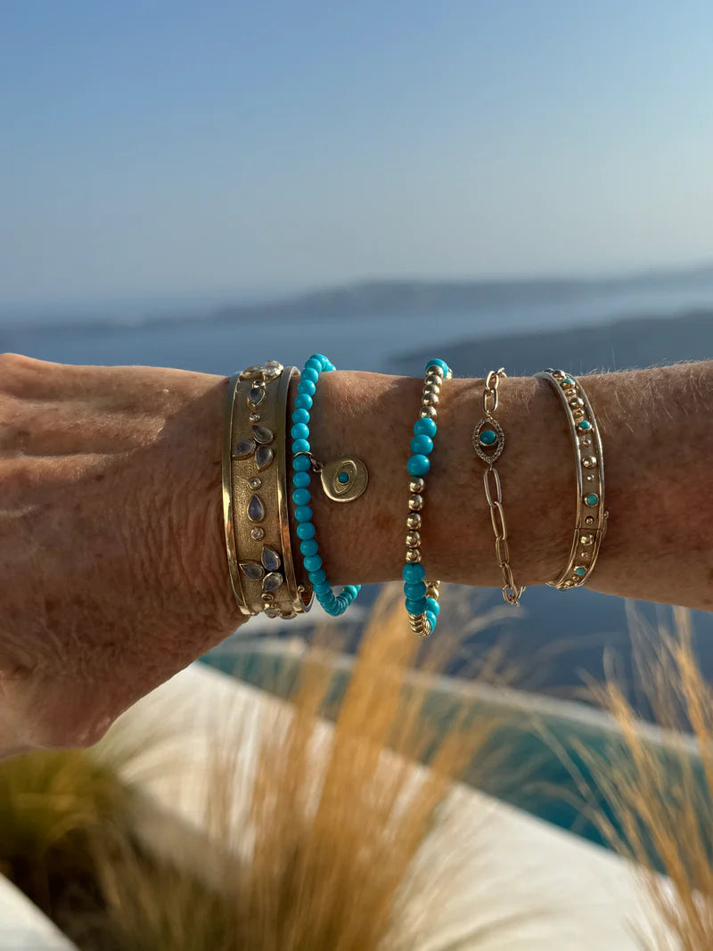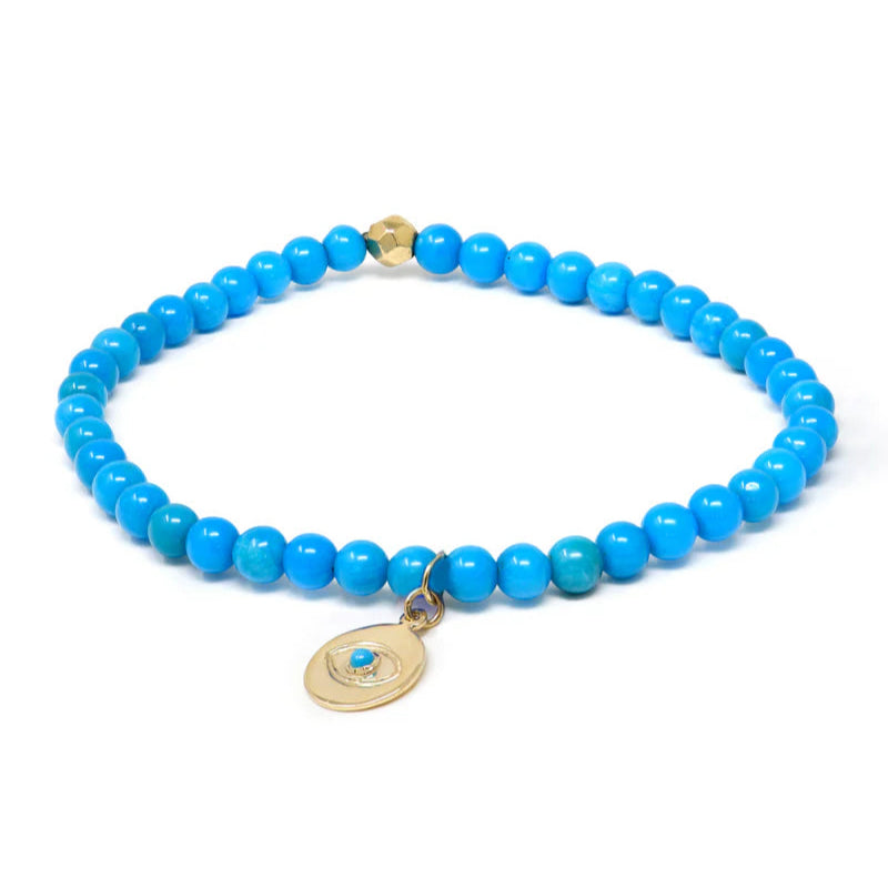 By Anzie, this bracelet is strung with rare Sleeping Beauty turquoise beads, featuring a 14k yellow gold evil eye charm with a small blue turquoise at its center.