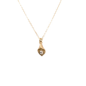 A dainty Calla Lily bloom from Anette Ferdinandsen hangs from a 18K yellow gold chain with a diamond briolette at its center.
