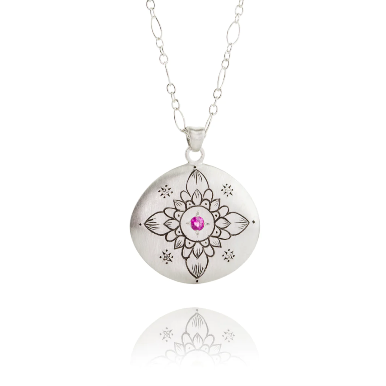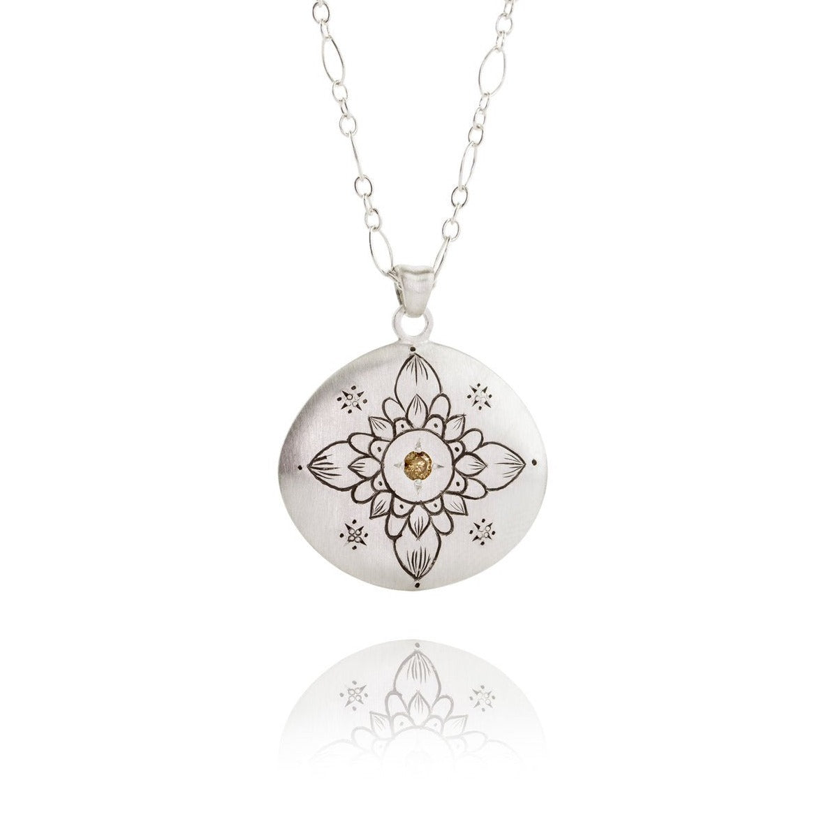 This exquisite pendant features your choice of a luminous champagne diamond or a sweet pink sapphire set within engraved sterling silver. Handcrafted by jewelry designer Adel Chefridi, this pendant is a timeless and elegant addition to any jewelry collection. The sterling silver is expertly engraved and the soft hue of the stone adds a special touch of sophistication.