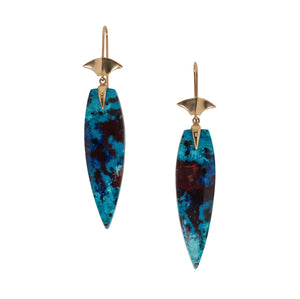 From Annette Ferdinandsen, these earrings are made out of 14k yellow gold, featuring stunning carved chrysocolla with shattuckite inclusions.