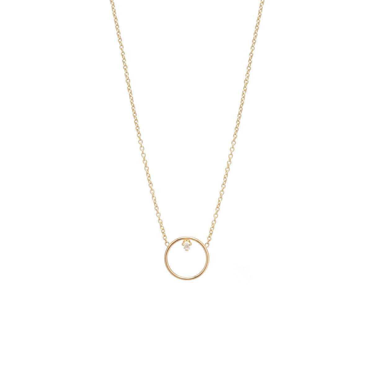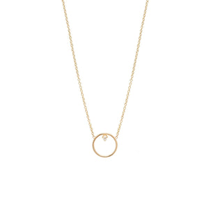 Zoe Chicco's 14k Yellow Gold medium circle necklace with a single prong set Diamond at the top. Approximately .03 total carat weight.