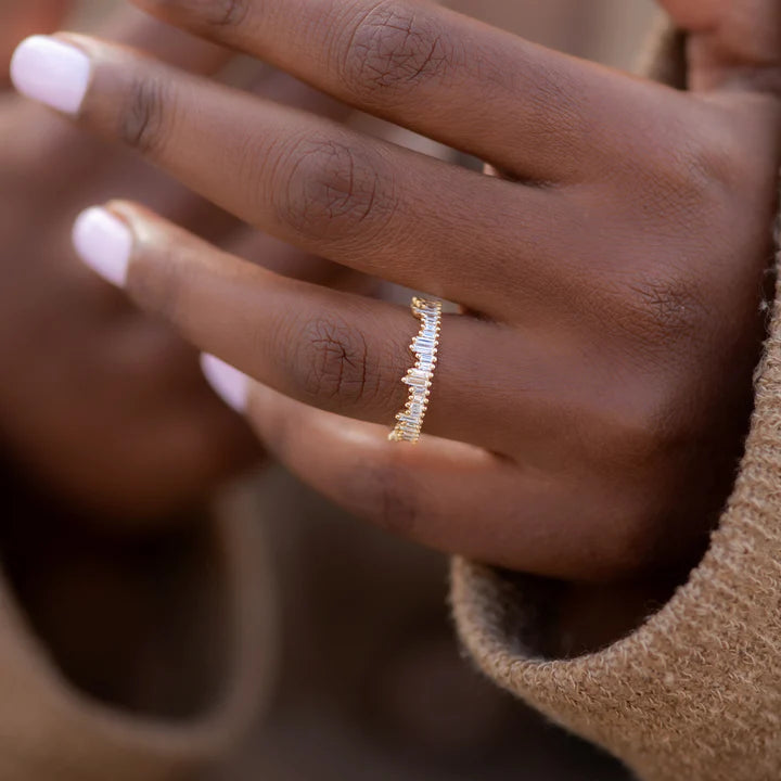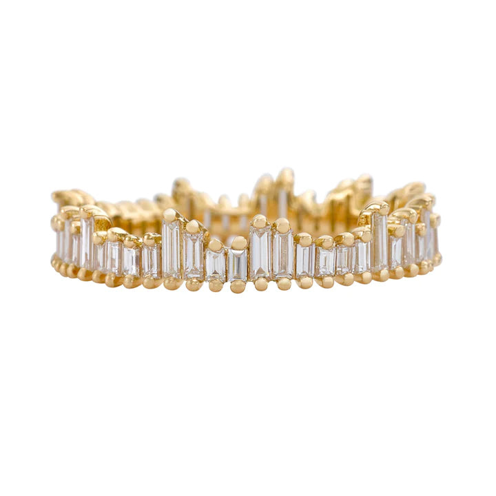 The Cityscape Eternity ring by Artemer features needle baguette diamonds set in luscious 18K yellow gold, creating a sparkling panorama. This ring spotlights an assortment of needle baguette diamonds that wrap all the way around your finger, resembling a glamorous and futuristic city block.