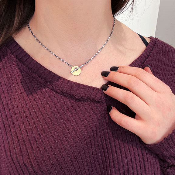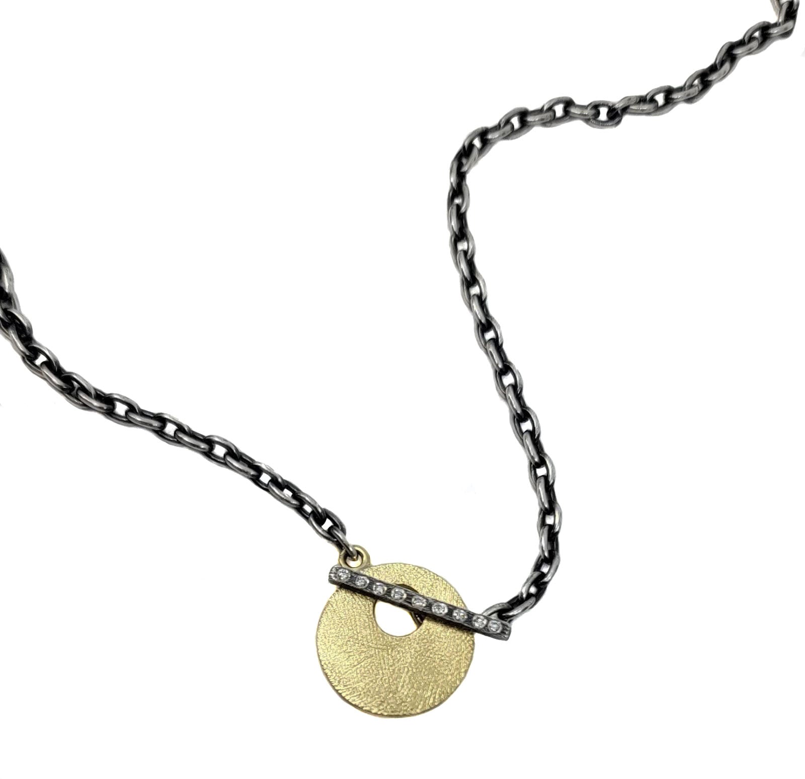The Claire SM Necklace by Rene Escobar is made out of 18k yellow gold and sterling silver with a 17 inch chain with 0.09 tcw white diamonds are flush set in the toggle clasp.