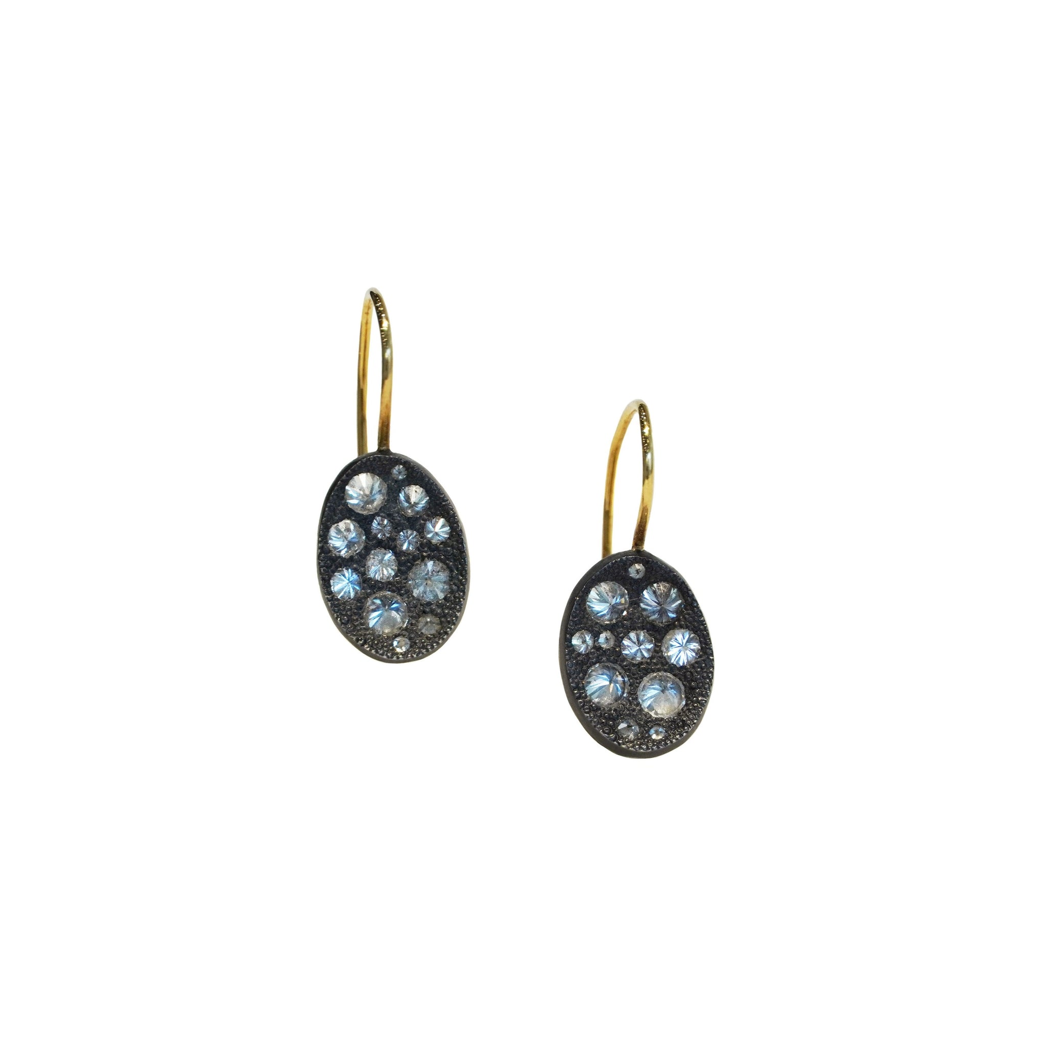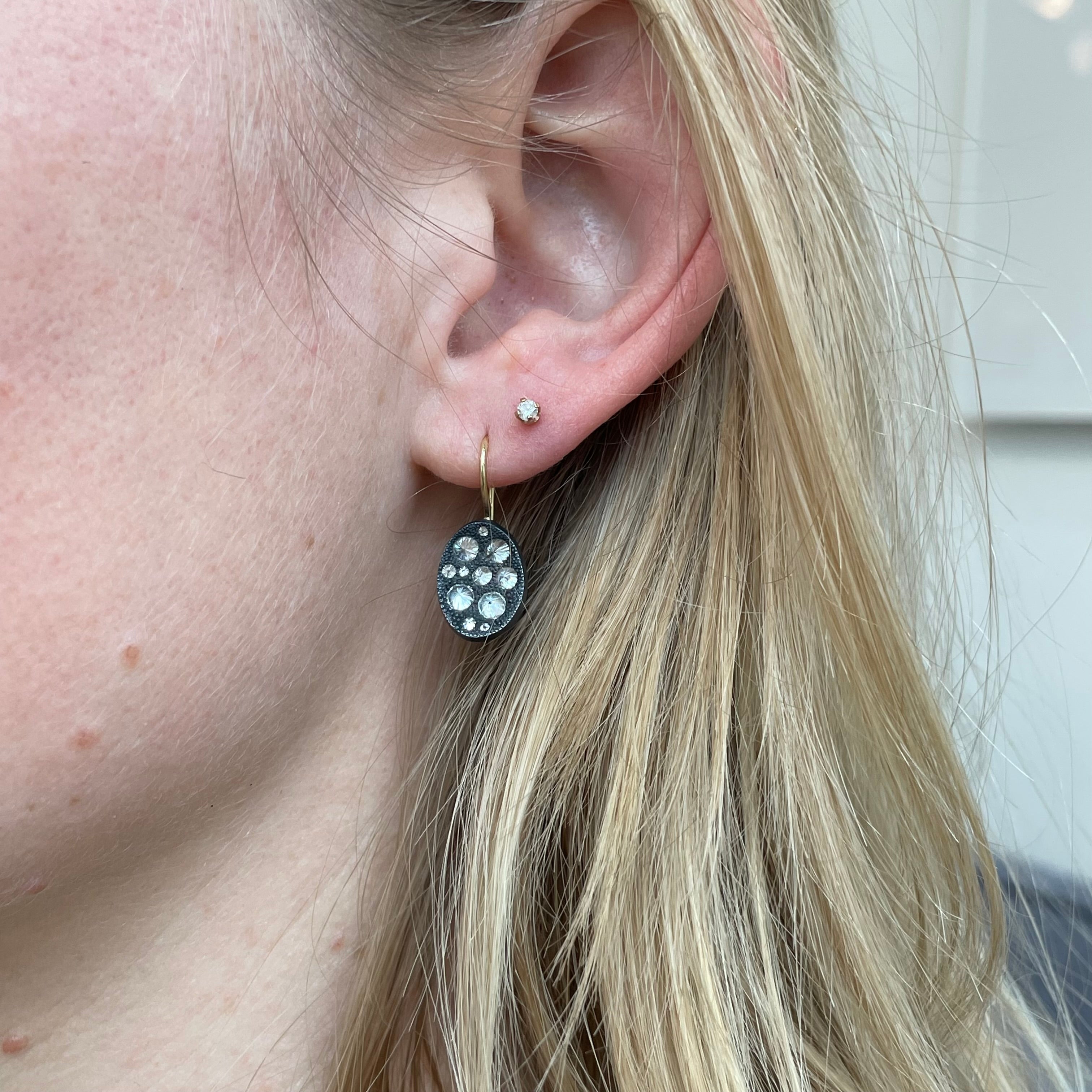 Concave, oxidized oval drops from TAP by Todd Pownell set with inverted diamonds hang from 18k gold ear wires.