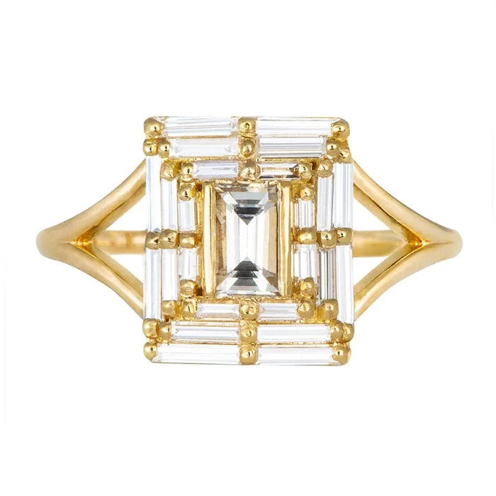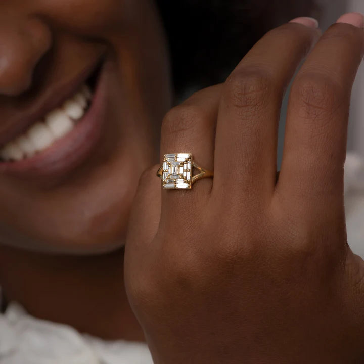 The Diamond Baguette Temple ring by Artemer is an exquisite array of needle baguette diamonds that form geometrically around a center baguette diamond. This enchanting and glamorous art deco inspired ring is sophisticated and elegant, characterized by smooth lines, geometric shapes and streamlined forms.