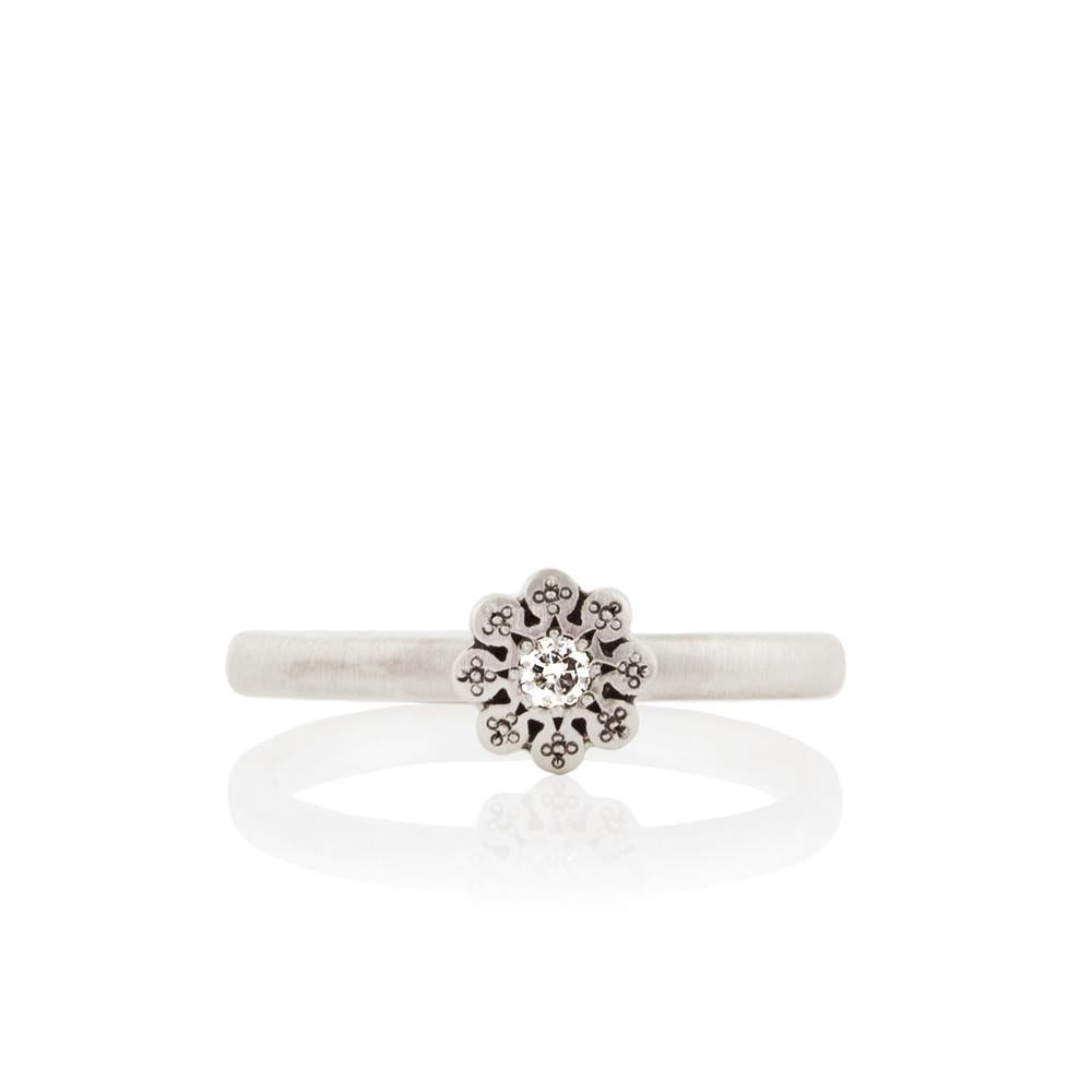 Adel Chefridi's small moonflower design set with a diamond center on a simple silver band.