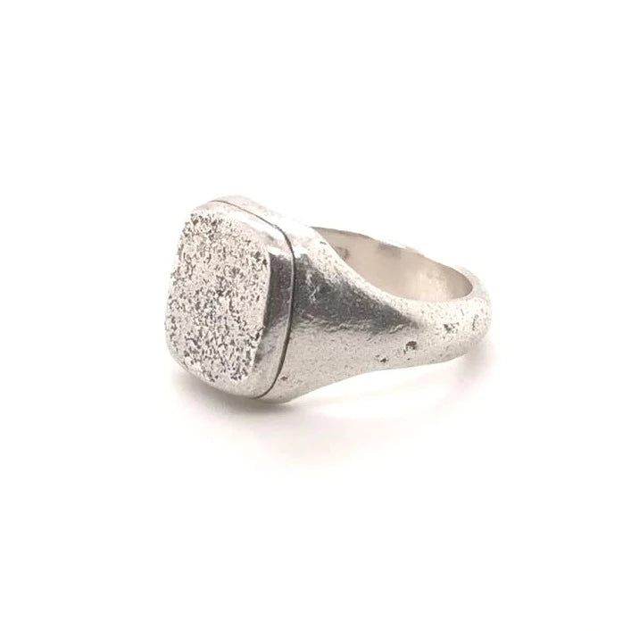 From John Varvatos, this signet ring is made of sterling silver with a flat distressed square top. This ring is perfect for the individual looking for the simple yet interesting staple ring to add to their collection.